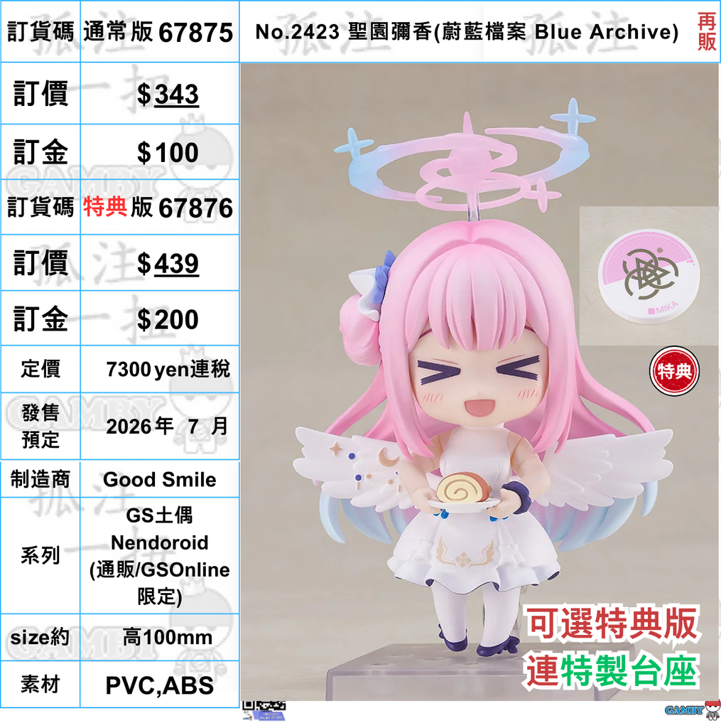 訂貨碼:67875&67876 <訂價$343&435> #(免手續費)No.2423 聖園彌香(蔚藍檔案 Blue Archive) 再販=GS土偶Nendoroid