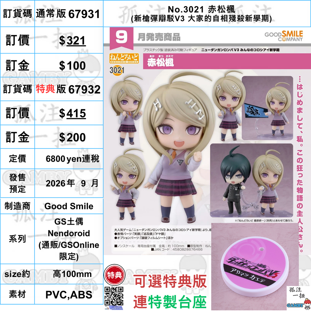 訂貨碼:67931&67932 <訂價$321&415> #(免手續費)No.3021 赤松楓(新槍彈辯駁V3 大家的自相殘殺新學期)=GS土偶Nendoroid