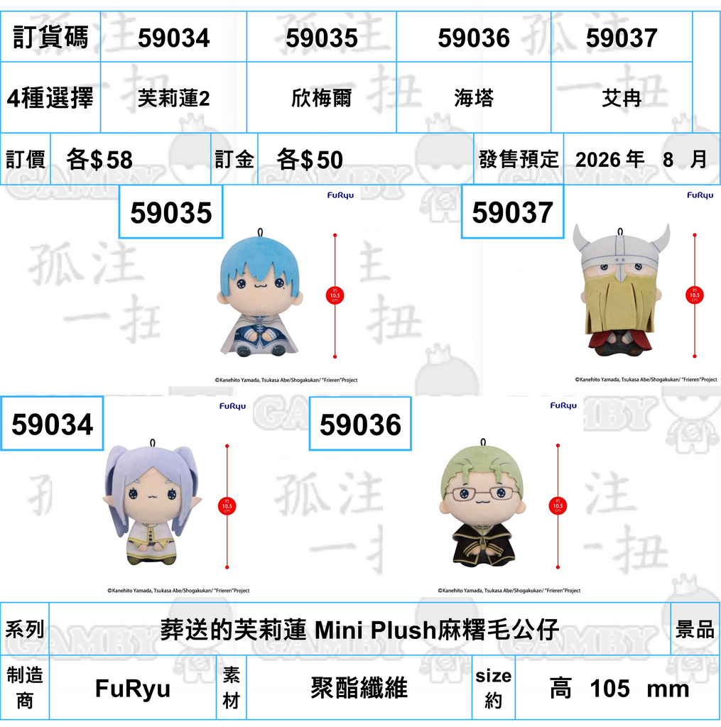 訂貨碼:59034-59037 <訂價各$58> #(免手續費)葬送的芙莉蓮 Mini Plush麻糬毛公仔