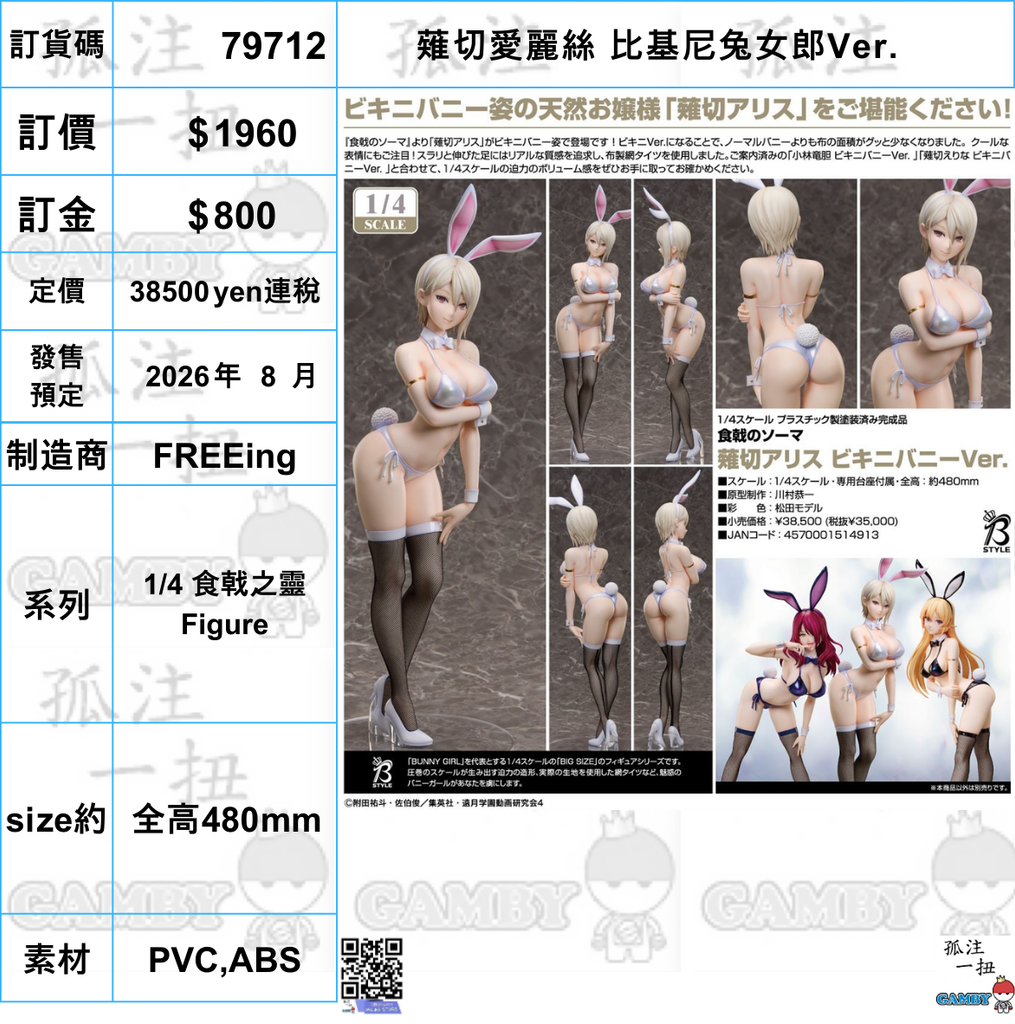 訂貨碼:79712 <訂價$1960> #(免手續費)薙切愛麗絲 比基尼兔女郎Ver.=1/4 食戟之靈 Figure
