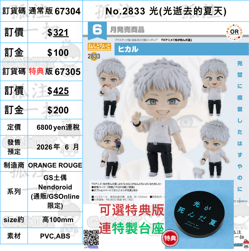 訂貨碼:67304&67305 <訂價$321&$425> #(免手續費)No.2833 光(光逝去的夏天)=GS土偶Nendoroid