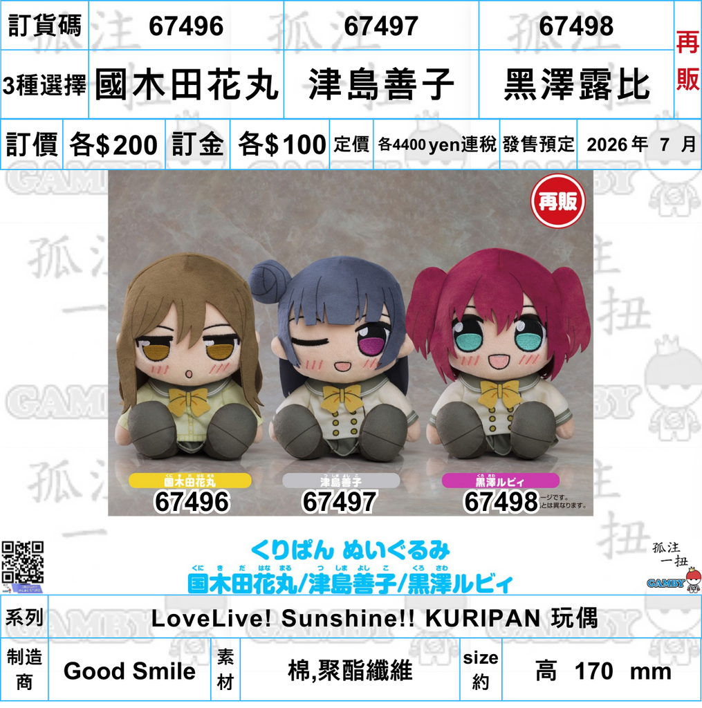 訂貨碼:67496-67498 <訂價各$200> #(免手續費)國木田花丸/津島善子/黑澤露比(Aqours)再販=LoveLive! Sunshine!! Kuripan 玩偶