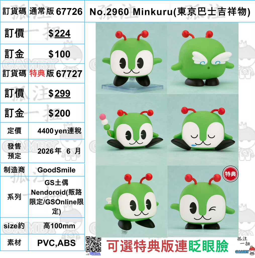 訂貨碼:67726&67727 <訂價$224&$299> #(免手續費)No.2960 Minkuru(東京巴士吉祥物)=GS土偶Nendoroid