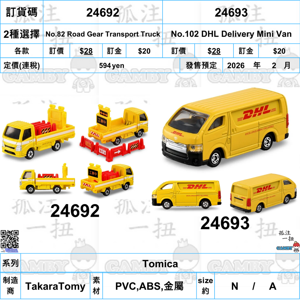 訂貨碼:24692&24693 <訂價各$28> #(免手續費)No.82 Road Gear Transport Truck/No.102 DHL Delivery Mini Van=Tomica