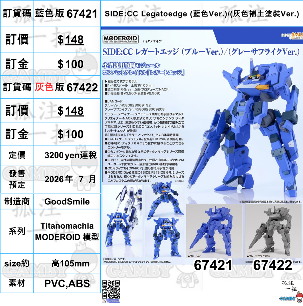 訂貨碼:67421&67422 <訂價各$148> #(免手續費)SIDE:CC Legatoedge(Titanomachia)=MODEROID 模型