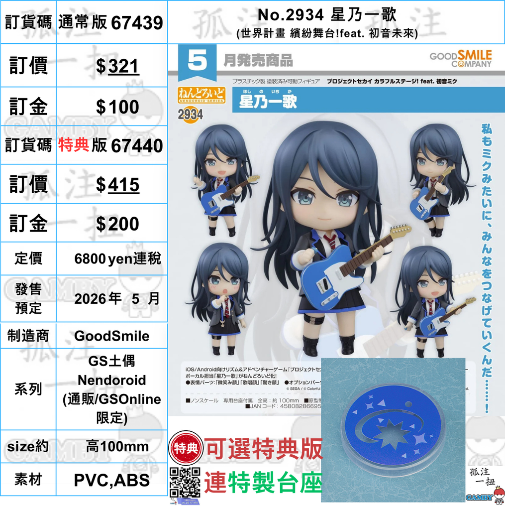 訂貨碼:67439&67440 <訂價$321&$415> #(免手續費)No.2934 星乃一歌(世界計畫 繽紛舞台!feat. 初音未來)=GS土偶Nendoroid