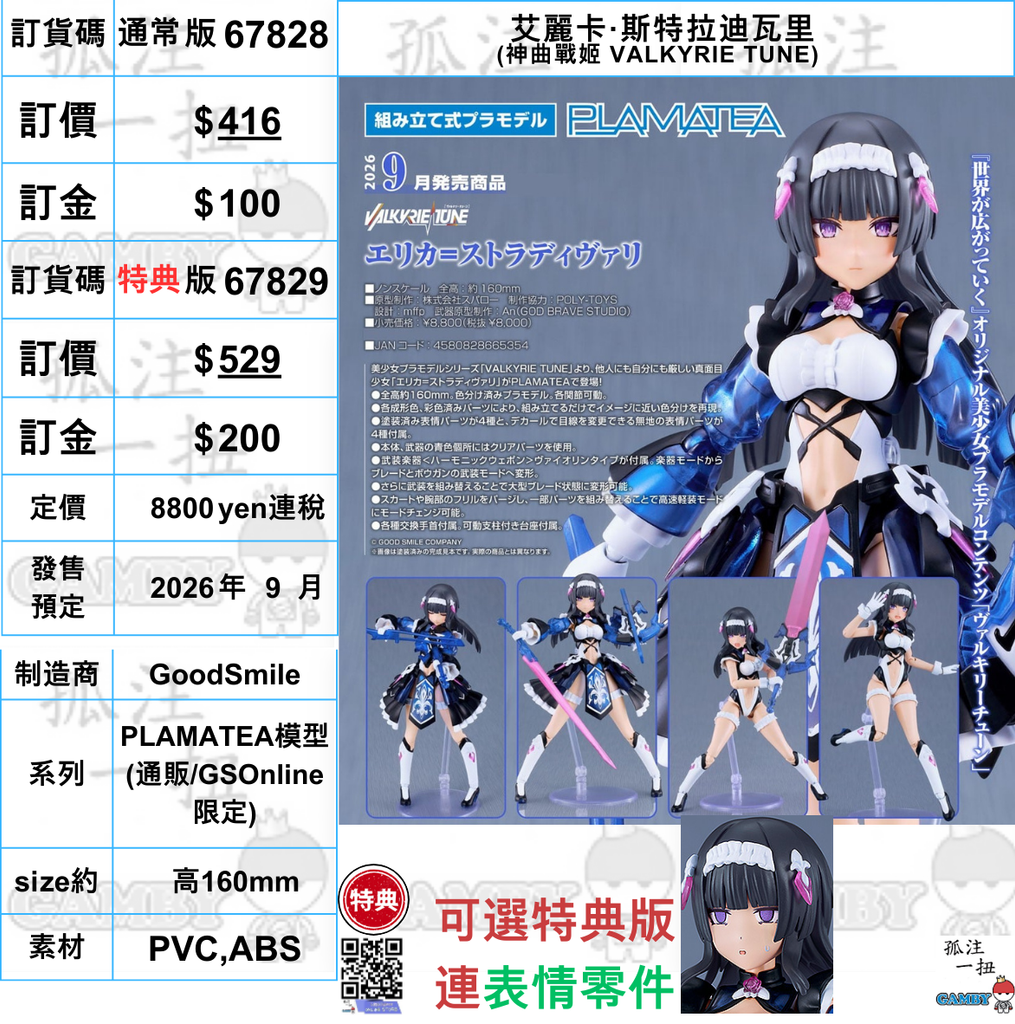 訂貨碼:67828&67829 <訂價$416&529> #(免手續費)艾麗卡·斯特拉迪瓦里(神曲戰姬 VALKYRIE TUNE)=PLAMATEA模型