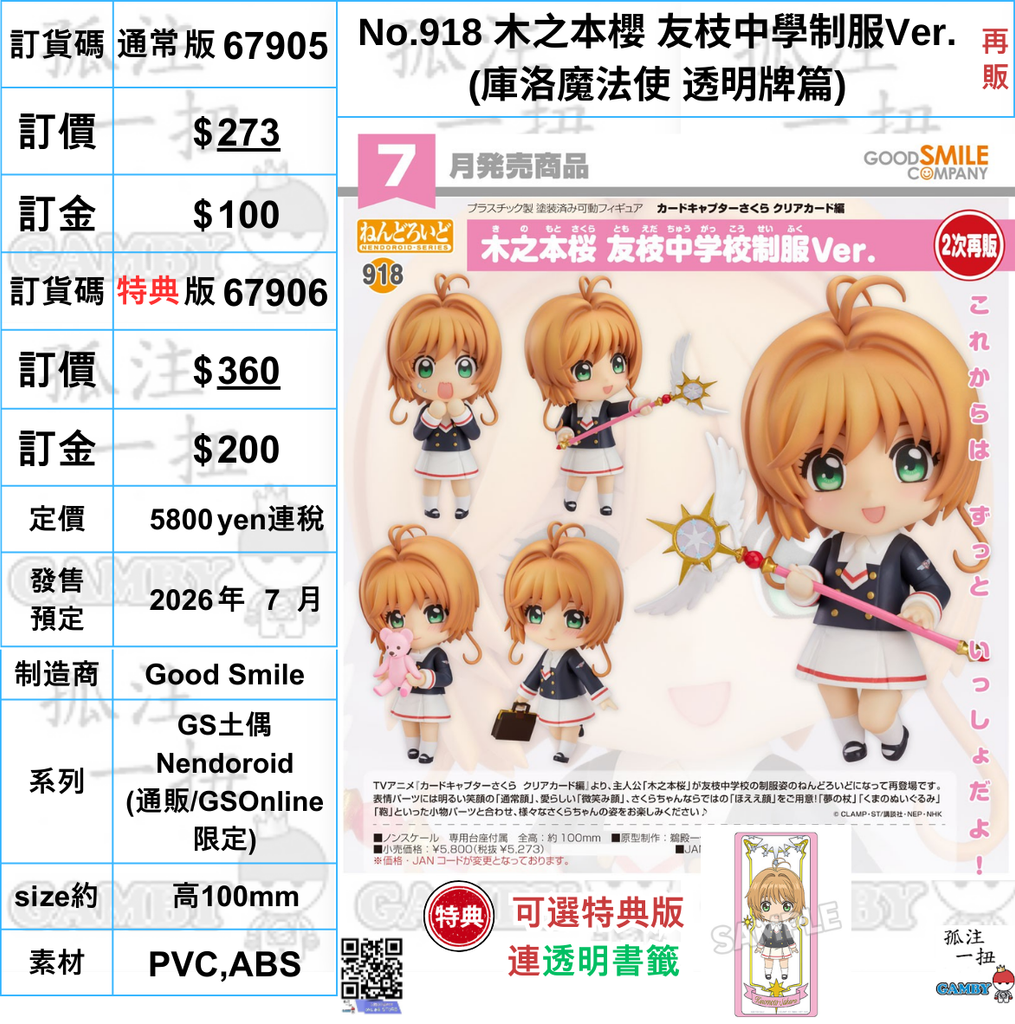 訂貨碼:67905&67906 <訂價$273&360> #(免手續費)No.918 木之本櫻 友枝中學制服Ver.(庫洛魔法使 透明牌篇)再販=GS土偶Nendoroid