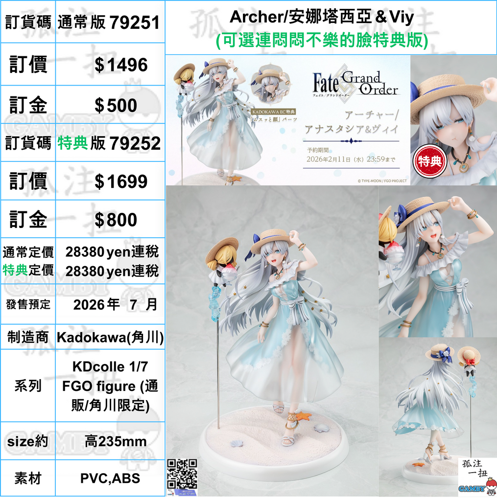 訂貨碼:79251&79252 <訂價$1496&1699> #Archer/安娜塔西亞&Viy=KDcolle 1/7 FGO figure