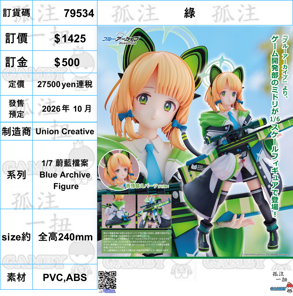 訂貨碼:79534 <訂價$1425> #(免手續費)綠=1/7 蔚藍檔案Blue Archive Figure