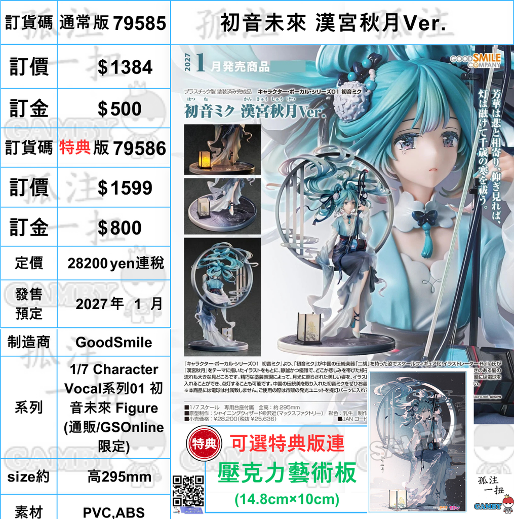 訂貨碼:79585&79586 <訂價$1384&1599> #(免手續費)初音未來 漢宮秋月Ver.=1/7 Character Vocal系列01 初音未來 Figure
