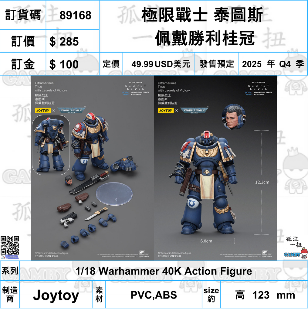 訂貨碼:89168 <訂價$285> #(免手續費)極限戰士 泰圖斯 佩戴勝利桂冠=1/18 Warhammer 40K Action Figure